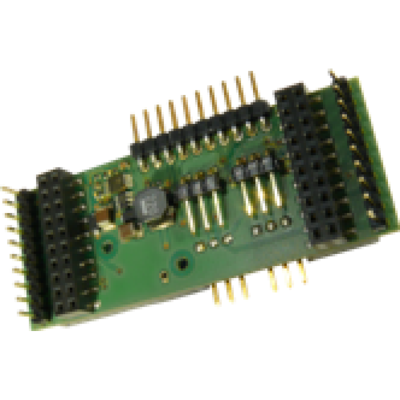 Zimo LOKPL96LV wie LOKPL96LS, aber mit 42 Stifte = 3 x 10-pol Stiftleiste + 4 x 3-pol.Stiftleiste (für Servos) und eigener Spannungsquelle 5V für Funktions-Ausgänge und Servos, 4 Servo Anschlüsse (je 3-polige Stiftleiste: Steuerleitung, Masse, 5V)